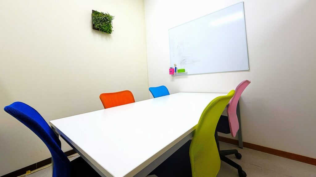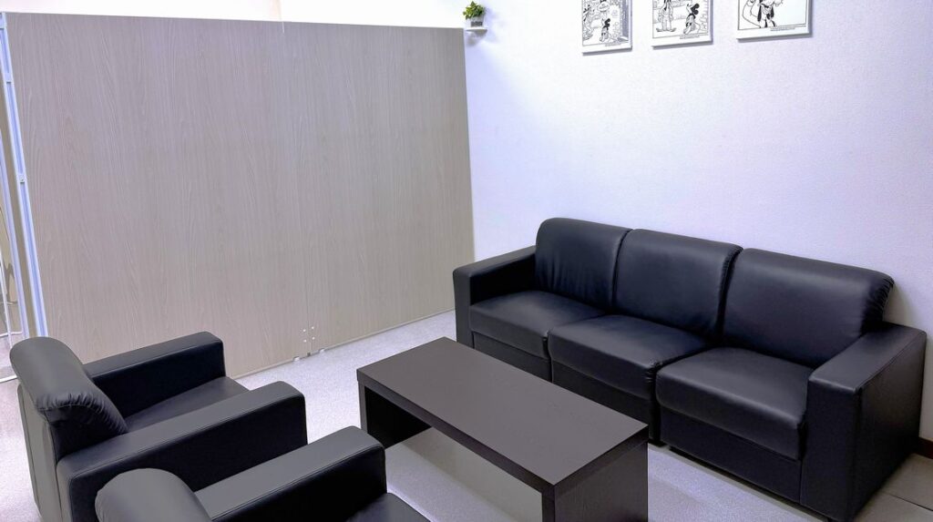 応接セットまたはデスクのある落ち着いた空間の中、商談いたします。最大4名様までの来客にも対応可能です。